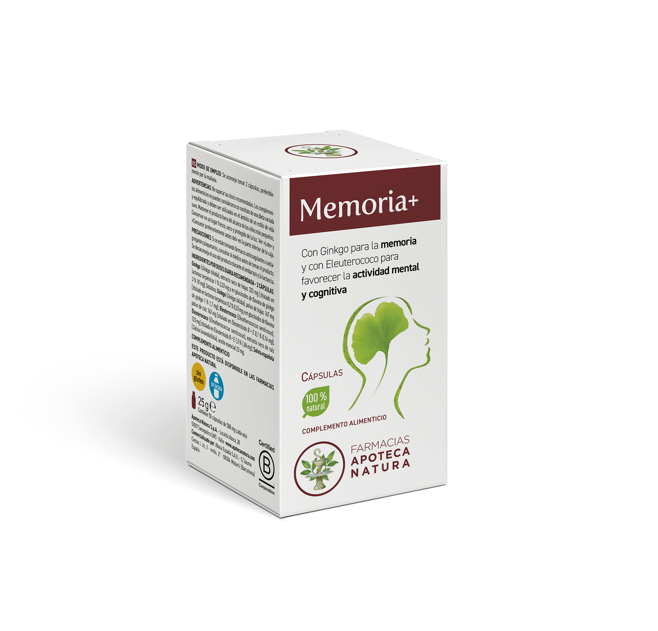 Memoria +, es un complemento alimenticio que, gracias a su formulación completa con Ginkgo, Eleuterococo y Salvia Española, apoya fisiológicamente los procesos mentales y físicos más importantes, especialmente durante los periodos de intenso estudio o trabajo y con el avance de la edad.